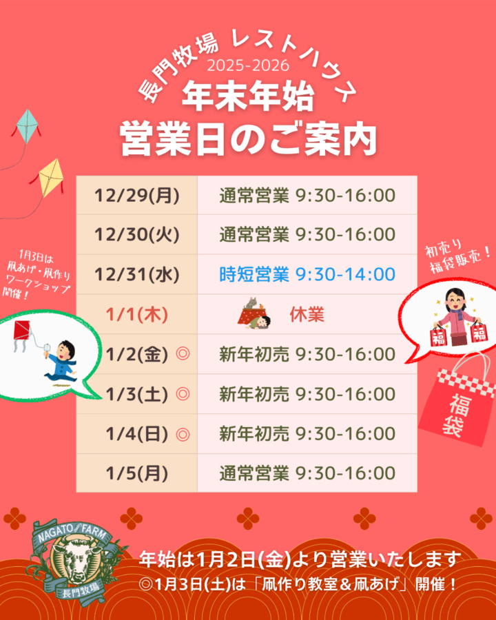 年末年始営業日のご案内 2025.12.14 お知らせ 長門牧場レストハウス年末年始の営業について レストラン、売店は26日から31日まで毎日営業いたします。 31日は時短営業。午後2時の終了となります。 年明けは2日より営業 新年初売り開催! 牧場の乳製品やスイーツが入った福袋を準備してご来場をお待ちしております。 3日は午前11時から、恒例の和凧教室を開催! 和凧を作り、牧場で高く揚げてみましょう。 問い合わせは 長門牧場 電話0267(55)6969へ。 お知らせ一覧へ 次の記事へ